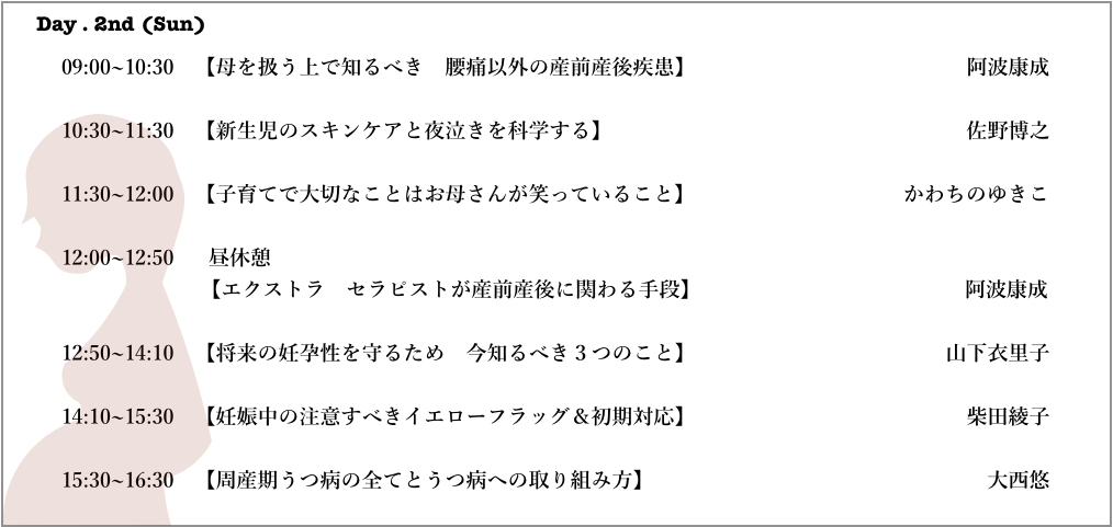 産前産後のケアを扱う助産師とセラピストにとって妊娠中のお母さんの注意点は最も大事なことの一つです。知らず知らずのうちに見逃してはいけないポイントを見逃してしまい悲劇を引き起こすことのないように知識をつけることが重要です。このセッションでは様々な注意すべき予兆や対応を余すことなく皆さんに伝えます。